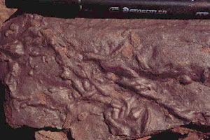 (1) Fig. 1: The horizontal burrow trace fossil, Treptichnus (formerly Phycodes and Trichophycus) pedum defines the lower boundary of the Cambrian in the reference section at Fortune Head, southeastern Newfoundland. [Image courtesy of Dr. Gerd Geyer, Institut für Paläontologie, Bayerische Julius-Maximilians-Universität, Würzburg, Germany.] |