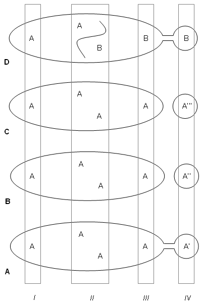 ![]() Fig. 1: Four hypothetical stratigraphic sections through an interval in which allopatric speciation has given rise to a daughter species, B, from the parent population of A. |