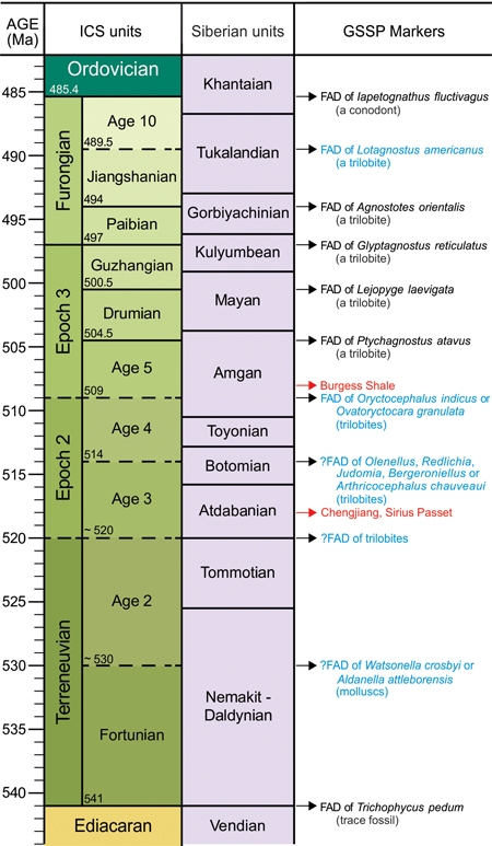 The International Subcommission on Cambrian Stratigraphy has settled on an age of 541 Ma for the Precambrian-Cambrian boundary, and 485.4 ± 1.9 Ma for the Cambrian-Ordovician boundary (Cohen et al. 2015, 2017). These are the values adopted throughout this site. |